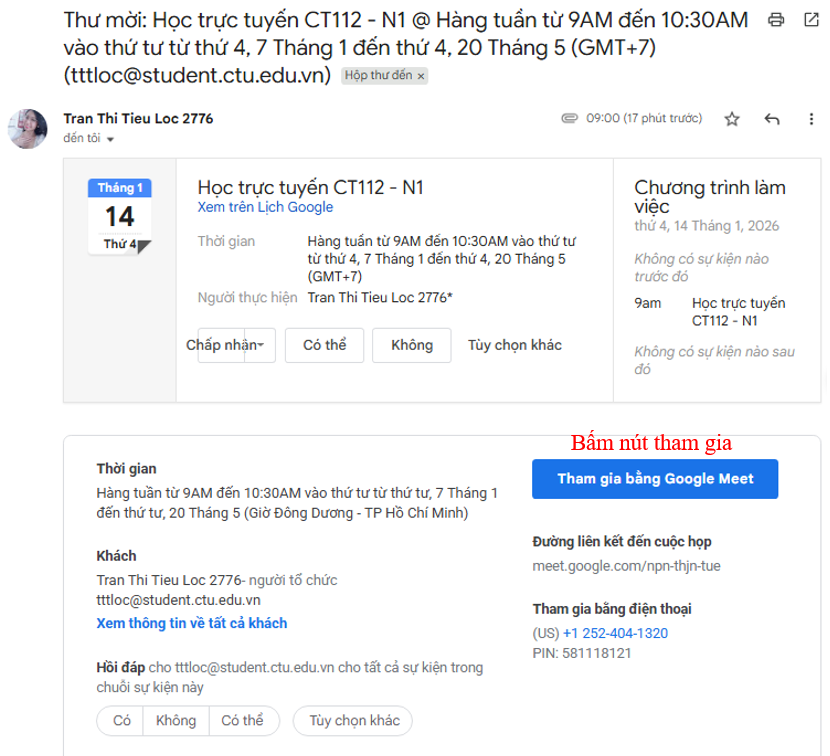Bước 6: Đến ngày diễn ra buổi học trực tuyến giảng viên và sinh viên sẽ thầy buổi học có sẵn trên Google Meet và chỉ cần click chuột vào buổi học (hoặc có thể sử dụng link của buổi học xuất hiện trong qua trình đặt lịch và trong email gởi tới sinh viên)