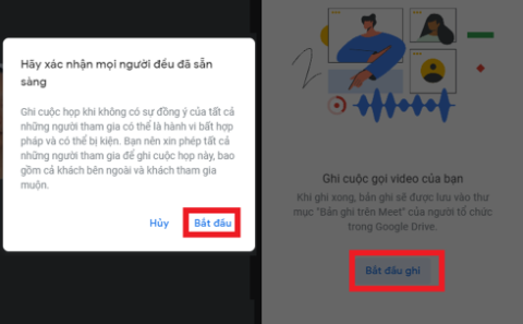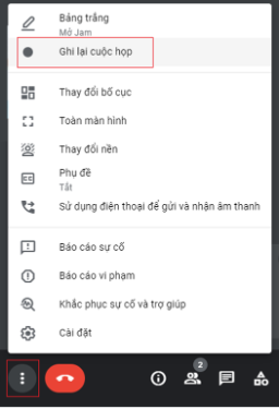 Bước 5: Ghi hình cuộc họp chọn nút Tùy chọn khác và chọn Ghi lại cuộc họp -> Bắt đầu ghi -> Bắt đầu (file video sẽ được lưu trên Google Drive và hệ thống sẽ có email thông báo tên file cho người ghi hình), Khi muốn kết thúc ghi hình chọn Tùy chọn khác->Dừng ghi