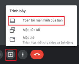 Bước 6: Thuyết trình trong cuộc họp, chọn biểu tượng Trình bày ngay/Present now, sau đó chọn Your entire screen/Toàn bộ màn hình của bạn hoặc A window/ Một cửa sổ hoặc A Tab / Một thẻ để trình chiếu