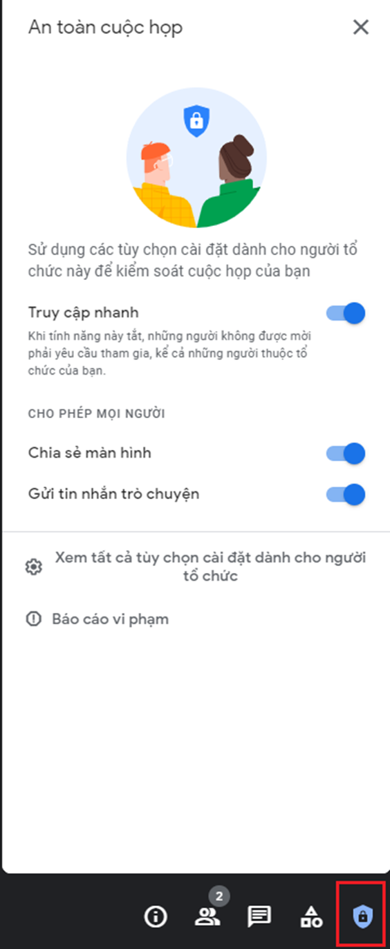 Chọn nút Bộ điều khiển của người tổ chức sau đó tùy tình huồng có thể: tắt Truy cập nhanh (người không được mời tham gia sẽ phải hỏi và được phép của Người tổ chức mới vào học/họp được), tắt Chia sẻ màn hình (không cho người tham gia chia sẻ màn hình trừ Người tổ chức) và tắt Gởi tin nhắn trò truyện.