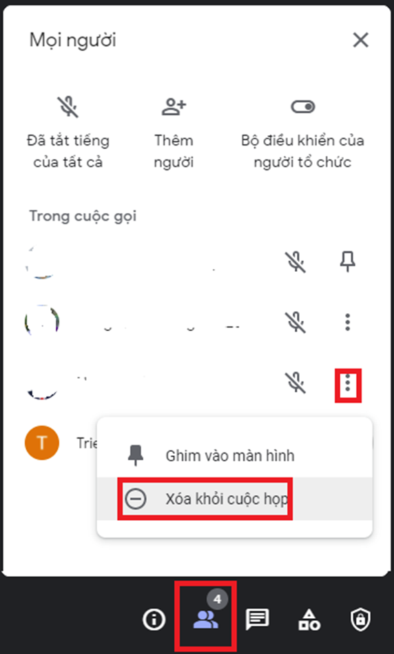 hoặc Xóa một người khỏi cuộc họp (chọn biểu tượng Thao tác khác, dấu ba chấm ngay tên người muốn xóa)