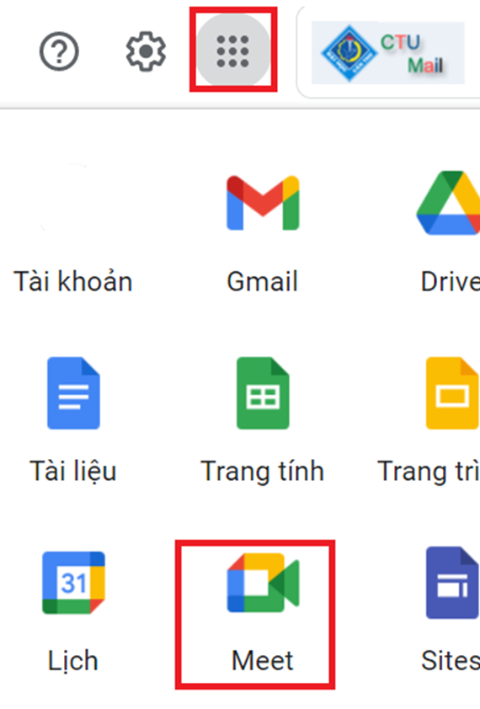 Bước 2: Chọn các ứng dụng của Google sau đó chọn Meet