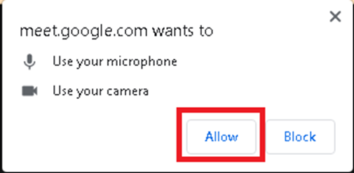 Bước 4: Chọn Allow để cho phép Meet sử dụng Camera và Microphone trên máy tính.