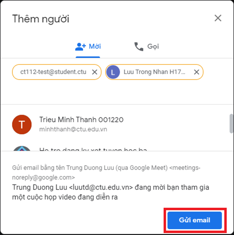 Sau đó trên mục Mời gõ vào email hoặc email group của những người muốn mời rồi bấm Gởi Email