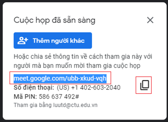 Bước 5b: Có thể mời thành viên tham gia học/họp bằng cách chép và chuyển (email) cho họ liên kết (URL) của buổi học/họp. Quí thầy cô giảng dạy lớp học phần có thể sử dụng địa chỉ Email Group của lớp học phần để mời tất cả sinh viên tham gia lớp học.